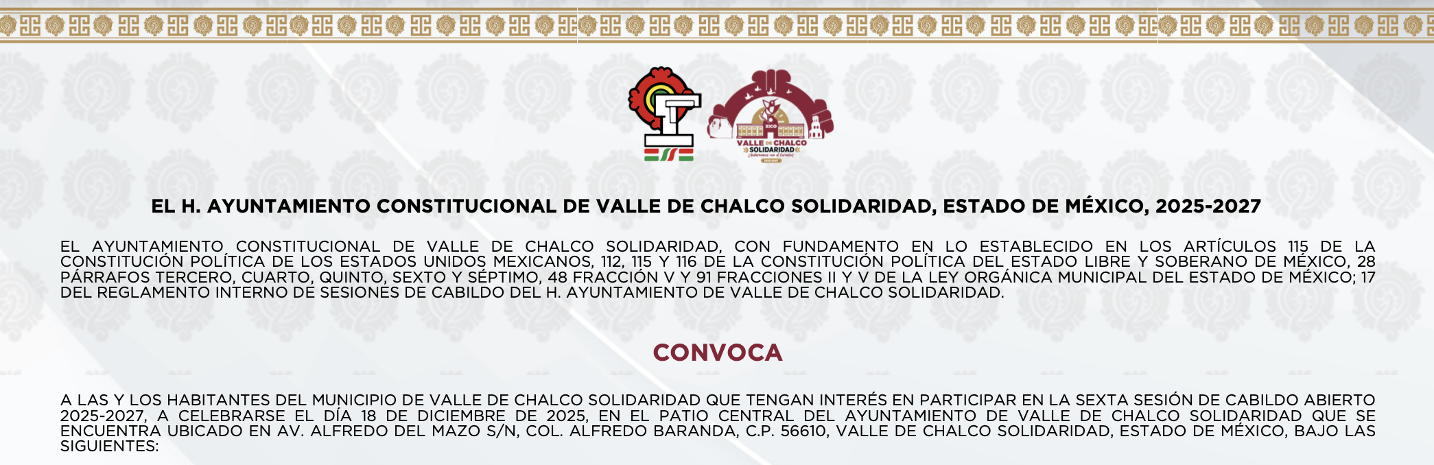 2025-2027, A CELEBRARSE EL DÍA 18 DE DICIEMBRE DE 2025, EN EL PATIO CENTRAL DEL AYUNTAMIENTO DE VALLE DE CHALCO SOLIDARIDAD QUE SE